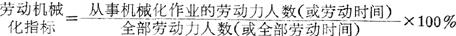 | 释义 | 劳动机械化指标 指从事机械化作业的劳动力人数(或劳动时间)对全部劳动力人数(或全部劳动时间)之比。 用百分数表示。计算公式为: