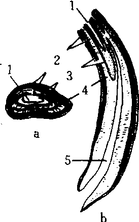 马下切齿断面 a.横切面 b. 纵切面 1. 齿坎 2. 骨质 3. 釉质 4. 牙质 5.齿髓腔 |