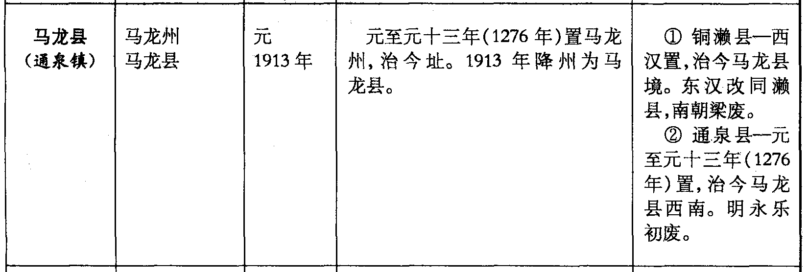 马龙县(通泉镇)马龙州马龙县元1913年元至元十三年(1276年)置马龙州,治今址。1913年降州为马龙县。❶ 铜濑县—西汉置,治今马龙县境。东汉改同濑县,南朝梁废。❷ 通泉县—元至元十三年(1276年)置,治今马龙县西南。明永乐初废。