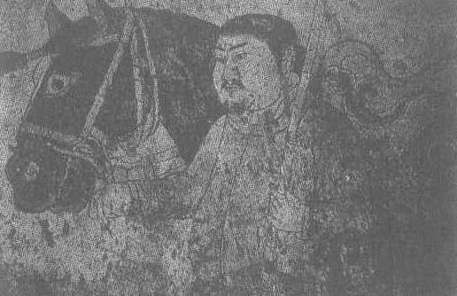 辽。驭者高137厘米。内蒙古自治区哲里木盟奈曼旗青龙山辽陈国公主驸马合葬墓墓道西壁壁画。驭者平头短须,浓眉大眼,脸型扁平,颧骨突出,相貌颇具特点。左手执鞭,斜于肩上。右手牵马缰。马为黑色,门鬃束结,颈系红缨,鞍鞯上饰云纹。马高大英俊,装备俱全,据推测可能为公主坐骑。此图画工精致,比例准确,线条干脆利落,是一幅优秀之作。