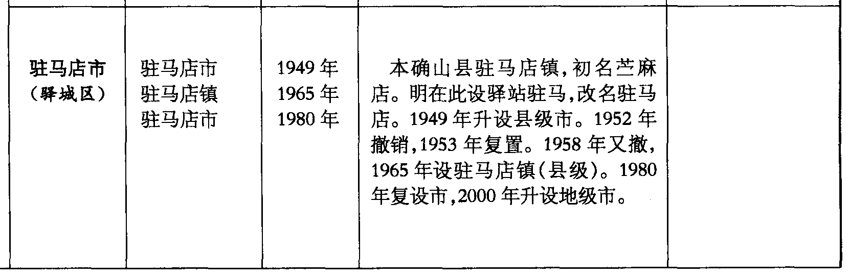 驻马店市(驿城区)驻马店市驻马店镇驻马店市1949年1965年1980年本确山县驻马店镇,初名苎麻店。明在此设驿站驻马,改名驻马店。1949年升设县级市。1952年撤销,1953年复置。1958年又撤,1965年设驻马店镇(县级)。1980年复设市,2000年升设地级市。