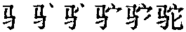 【提示】马,位于字左时,末笔的横改提。它,下面是匕,不要错写成七。 *驼(駝)〔駞〕tuó8画 马部 (1) 骆驼: ~峰|~绒。 (2) 脊背弯曲: ~背。 驼駝駞tuó小篆和古书作佗。佗本是负荷义,就指驮(tuó)。骆驼主要为人驮物。所以叫佗。转为名词。约六朝以前作驼(駝)。从马,它声。古汉语多单音词。古书也作槖(tuó,指一种口袋,似囊)佗。后作骆驼。如:驼峰(指骆驼背部隆起像山峰状的部分)。引申指人的身体向前曲,背脊突起像驼峰。如:驼背。 驼駝★繁◎常★常tuó駝,形声,从馬,它声,用于“骆驼”。见264页“骆”。引申为脊背弯曲。《简化字表》类推简作“驼”。 【辨析】 驼/驮 见417页“驮”。 驼〈动〉通“驮(tuó)”。用背部承载人或物体。 《聊·翻》四: 却说姜娘子~到赵家庄里。又 《禳》一: 俺那小舅来这里耍,骑着骡子牵着马,驴~担柦一大些。 |