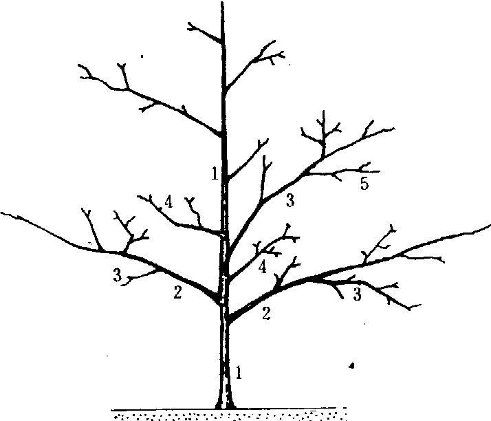 果树树冠骨架结构 1. 中心干; 2. 主枝; 3. 侧枝; 4. 辅养枝; 5. 枝组 侧枝 主枝上分生的二级骨干枝。是着生结果枝组的主要基枝。常依主枝的分布与强弱, 按适当的间距,有序选留。其分枝角度, 一般应大于主枝, 避免与主枝竞争营养, 同时又利于其上枝组形成花芽。第一侧枝距中心干很近的又称把门侧(枝), 容易分散主枝的势力, 又会造成内膛拥挤。盛果期早, 应限制侧枝生长过旺; 成龄大树, 则可以侧枝代替主枝, 以控制树冠大小, 维持树势。 副侧枝 在侧枝上分生的骨干枝。仅在大冠稀植的果树上选留。 骨干枝构成树冠的主要骨架部分的主枝和副主 枝,其数量、着生角度、生长势等与产量有密切关系。 骨干枝从茶树主干、主轴,根颈上产生的粗壮枝条。由根颈、主干上发出的叫“一级骨干枝”;由一级骨干枝上发出的叫“二级骨干枝”。余类推。 |