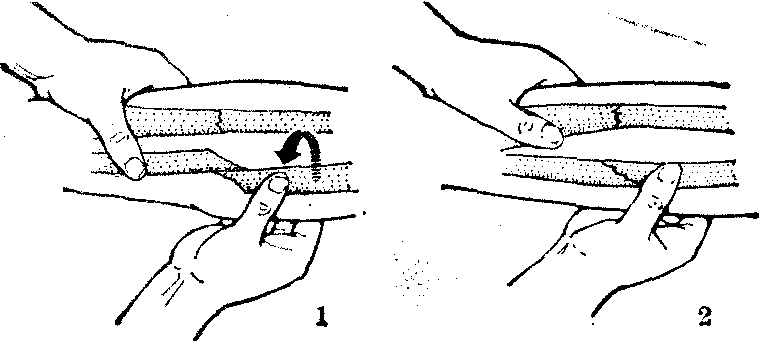 | 释义 | 骨折的手法复位 骨折的手法复位骨折后通过手法使骨折断端重新获得相对原状的措施为手法复位。骨折后,在断端之间可发生各种移位,如重叠、旋转、成角及侧方移位等。首先要对移位的骨折进行复位,即是将移位的骨折断端沿着移位相反的途径逆行回来。可采用综合复位,也可采用分解复位。复位时应争取一次完成。一次难以完全复位的骨折,可用局部外固定,通过夹板、纸压垫将残余移位逐渐复位。复位时应力争达到或接近解剖复位,使对位即两骨折端的接触面和对线即两骨折段在纵轴上的关系完全良好。有些骨折不能达到上述要求者,可根据病人不同情况尽可能作到功能复位,即虽未达到解剖复位,但骨折愈合后,对肢体功能并无影响。具体要求是骨折断端旋转,分离都必须完全矫正,肢体短缩在成人不超过1cm,儿童不超过2cm,长管骨横形骨折端对端对位达1/3,干骺端对位达3/4,在幼儿向前或向后成角移位因与关节活动方向一致,可在骨痂塑型期自行矫正,但在下肢,成人向前或后成角不超过10°,儿童不超过15°,向侧方成角因骨折处上下两关节活动的平面失去正常关系,例如胫骨骨折成角,膝踝两关节面失去正常平行情况,日后不能自行矫正,必须完全复位。又如股骨干骨折有向侧方成角畸形,如不复位,很难自行矫正,因此膝关节平面不与地面平行,能引起疼痛和创伤性关节炎。整复时间越早越好。选用适量的麻醉,达到复位时不疼痛。整复骨折不应在X线透视下操作,以免对医生和病人造成损害,透视仅是作为整复中短暂观察移位和对线情况用的。在整复前必须制定一个比较成熟的整复方案和适宜的整复手法。应用的手法有下列10种。 图1 旋转回绕 1.按原来移位的相反方向回旋 2. 背对背移位矫正 成角折顶 横断或锯齿型骨折,如病人肌肉发达,单靠牵引力并不能完全矫正重叠移位时,可用折顶手法(图2)。