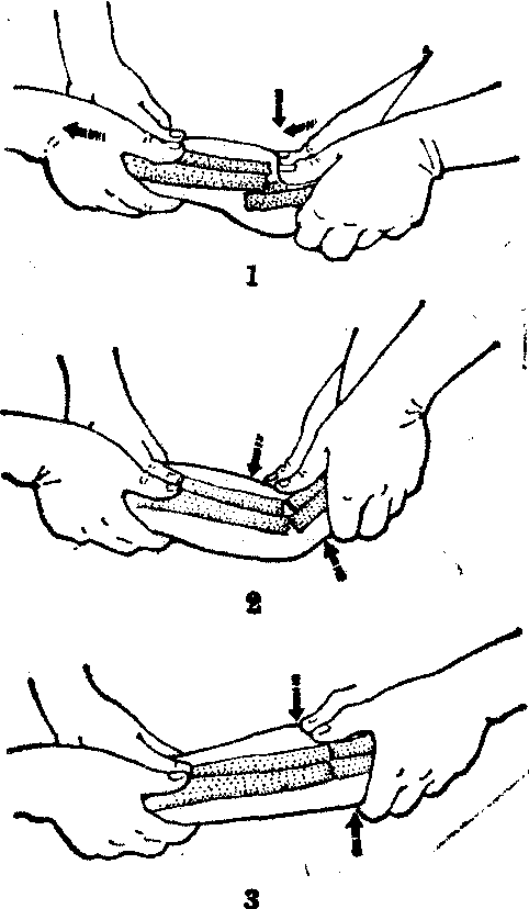图2 折顶手法 1. 加大成角 2. 断端相顶 3. 反折对位 端挤提按 以手指直接用力作用于骨折断端,矫正侧方及前后移位,有时重叠、旋转及成角移位矫正后留有侧方移位也以此法对合之。 夹挤分骨 凡是两骨并列部分发生骨折,如桡、尺骨骨折,胫腓骨骨折,掌骨骨折和跖骨骨折,骨折段因骨间肌或骨间膜的收缩,而互相靠拢。复位时,应以两手拇指及食、中、环三指,由骨折部的掌背侧夹挤骨间隙,使靠拢的骨折断端分开,远近骨折段相应稳定而复位。 摇摆触碰 经过以上手法,一般骨折即可基本复位。但横断或锯齿型骨折断端间,可能仍有裂隙。操作者可用两手固定骨折部,助手在维持牵引下轻微地左右或上下摇摆骨折远段,待骨折断端的骨擦音逐渐消失,骨折即紧密对合。 对扣捏合 施行于分离性骨折或粉碎骨折,用两手指交叉合抱骨折部,两手掌对向扣挤,把分离的骨折块挤紧、挤平、挤顺。 按摩推拿 主要是调理骨折周围的软组织,使扭转曲转的肌肉、肌腱随着骨折复位而舒展。 手法复位后用外固定。目前常用的外固定有小夹板,石膏绷带,外展架和持续牵引等。外展架固定适用于严重的上肢损伤伴有严重肿胀者,肩关节骨折和炎症,肩袖损伤等。 ☚ 骨折治疗原则 牵引术 ☛ |