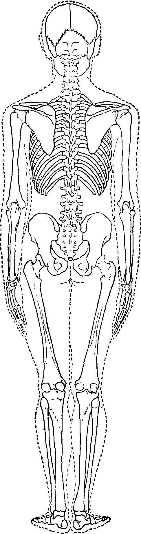 图3 全身骨胳(后面观) 用;其内层的细胞可分化为成骨细胞和破骨细胞,分别有造骨修复和对骨组织的破坏吸收功能。❷骨质,是骨的主要成分。密质居表层,在长骨厚而致密,由规则排列的骨板和骨细胞组成,抗压、抗扭曲力强。在短骨以及长骨端表面仅有薄层密质,而扁骨的密质可区分为内板和外板,两者隔以松质构成的板障,如顶骨。松质主要分布于端及其它骨的内部,成自交错排列的杆状或片状小梁,小梁之间的腔隙内含有红骨髓。骨小梁的排列在生物力学上具有重要功能意义,即在人体不同部位,各骨骨小梁的排列都与其所承受的压力以及相应的张力方向一致。 ❸骨髓,充填于髓腔及松质的腔隙内,主要由网状结缔组织和多种类型的细胞组成,并有丰富的血管分布。在胎儿及幼儿期,髓腔和松质腔隙内充满红骨髓,由网状结缔组织、血窦,不同发育阶段的血细胞及巨噬细胞等组成,主要功能是造血,清除衰老伤亡的血细胞和异物,并参与免疫反应等。自5~7岁起,从四肢远侧长骨开始,髓腔内的红骨髓逐渐为脂肪组织所代替,转呈乳黄色,称为黄骨髓,黄骨髓缺乏造血能力,但仍保持造血潜能,一旦机体需要,仍有可能转变成红骨髓,恢复造血功能。25岁后,红骨髓仅存在于椎骨、胸骨、肋骨、锁骨、肩胛骨、髂骨以及肱骨和股骨近侧端的松质腔隙内,因而临床上为检查骨髓象,常进行髂骨穿刺采样,据以诊断疾病。 ❹关节软骨成自透明软骨,覆被骨的关节面。参与关节的构成,终生不骨化。 人骨的硬度与韧性是由其化学成分所决定的。骨的细胞间质含无机和有机两种成分。有机物占人体干骨重量的30~40%,主要为骨胶原纤维和粘多糖蛋白 (含硫酸软骨素、硫酸角质、透明质酸),为骨提供韧性和弹性。无机物即骨盐,占骨总量的60~70%,主要为碱性磷酸钙 [Ca10(PO4)6(OH)2],碳酸钙,氟化钙,氯化钙等。骨盐在基质内的沉积保证了骨的坚强度。若以稀酸或络合剂乙烯二胺四醋酸(EDTA) 脱掉钙盐,仅剩下有机物,骨即柔软而易弯曲;如果以煅烧法焚烧有机质,留下无机质即成骨炭,虽然仍具骨的形态,但酥脆易碎。在人的一生中,骨的物理特性变化是骨所含有机质与无机质两者比例变化的结果。小儿骨的有机质相对为多,韧性大而硬度小,易受变形,若有骨折,往往折而不断;老年相反,骨的有机质相对地减少,故脆性较大易折。壮年期骨化学成分的比例适中,硬度大而富有弹性,骨质坚韧。