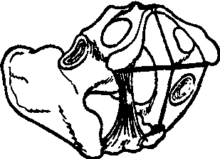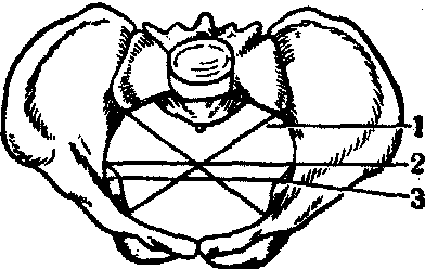 图8 骨盆中段平面径线 (3)出口平面: 由骶骨末端环绕两坐骨结节,沿两耻骨坐骨支达耻骨联合下端,后侧缘以骶结节韧带为界限,尾骨可自由活动,如骶尾关节固定,其后据点即为尾骨端。出口平面由两个在不同平面的三角形组成。前三角的顶端是耻骨联合下缘,两侧是耻骨降支; 后三角的顶端是骶尾关节,两侧为骶结节韧带。两三角底边为坐骨结节连线(图9)。