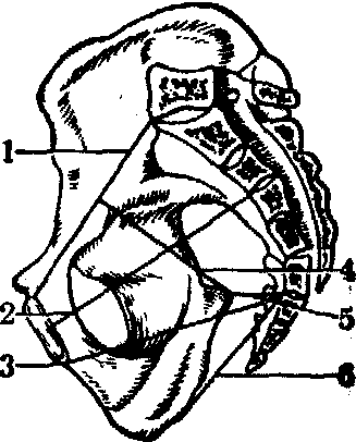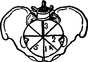 图6 中段横径测量法,柯氏骨盆出口测量器 骨盆X线测量 较临床测量更为直接而准确,除能测得骨盆解剖径线长度,更能了解骨盆形态、胎头大小及位置、头盆关系。故对诊断头盆关系有重要价值。X线测量投照三张胶片,即侧面像、入口像、耻骨弓像。通过X线可测得以下径线。 (1) 入口平面: 前方起源于耻骨联合上缘下1cm处的突起点,沿两髂耻线越骶髂关节,在后方会合于骶岬下1~2cm处的一点。此平面有5条径线(图7): ❶前后径系前后两据点的间距为11.6±1.44cm。 ❷横径系两髂耻线间最大间距为12.3±0.67cm。 ❸后矢状径系横径中央点至后据点间距,长5.2±0.76cm。 ❹斜径系一侧骶髂关节至对侧髂耻结节间径 左右斜径相等。 ❺骶耻内径系耻骨联合下缘至骶岬的间距,长13.3±0.92cm。