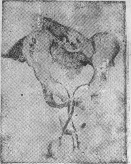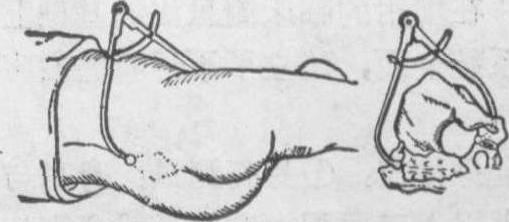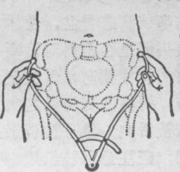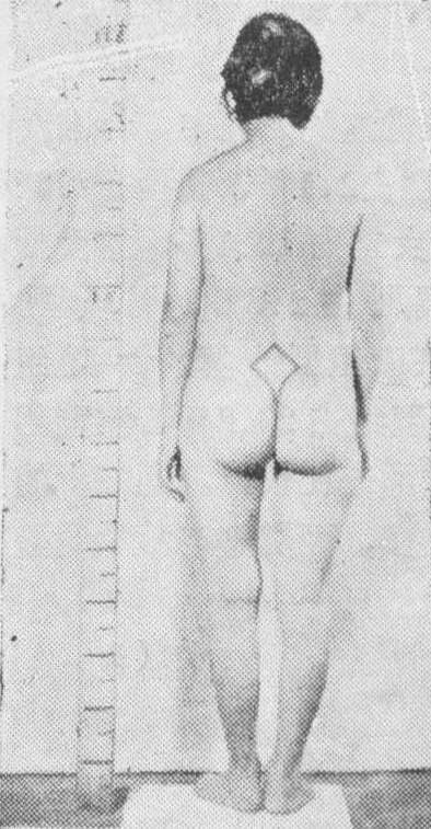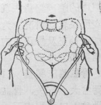 图2 歪斜变形米氏区 (3) 骨盆外测量,按下述顺序进行: ❶测量骶耻外径:孕妇取左侧卧位。左腿屈曲,右腿伸直,前据点在耻骨联合上缘下1cm,后据点为米氏区顶点,间距为20.5±1.02cm。此径线可间接估计骨盆入口前后径的大小,菱形的上角相当于第五腰椎棘突所在处,两侧角相当于髂后上棘。下角为两侧臀肌交叉点。第五腰椎棘突约在两髂后上棘连线中点以上2~2.5cm处,亦约在两髂嵴连线中点下1.5cm处。如果菱形不明显时也可按髂嵴连线找第五腰椎棘突所在处(图3)。 ❷测量髂棘间径:孕妇仰卧,据点为两髂前上棘外缘,间距为25.2±1.41cm。此径间接估计入口横径尺度(图4)。 ❸测量髂嵴间径:髂嵴为一弓形结构,无明确据点。测量时将测量尺的两端沿两嵴外缘循行至两嵴间最大距离,即为髂嵴间径,此径亦用作估计入口横径尺度。间距为28.4±1.11cm(图5)。上述测量结束后,孕妇两腿略为弯曲,检查者面向阴部,行以下检查。 ❹骨盆前部高度: 为估计骨盆深浅的指标,上据点为耻骨横支上线,下据点为坐骨结节正中区,间距为9.3±0.75cm。 ❺耻骨联合高度:亦为估计骨盆深浅的指标,上据点为耻骨联合上缘,下据点为其下端。间距为5.6±0.48cm。 ❻耻骨弓检查: 两拇指沿耻骨支向下滑行,了解耻骨坐骨支曲度,可估计耻骨弓为女型或男型,其顶端角度为84.20±7.35°。 ❼出口横径: 两坐骨结节间距,孕妇仰卧。两手紧抱双膝,使髋关节及膝关节全屈,以使坐骨结节突出,测量坐骨结节前据点内侧缘的距离,临床测量值为9.0±0.75cm。此径线系骨盆出口的横径,一般所用测量为汤姆斯(Thoms)及狄利(Delee)测量器, ❽ 出口前后径: 系耻骨联合下缘至骶尾关节外表面的间距,为12.3±1.17cm。 ❾出口后矢状径:系出口横径的中央点至骶尾关节外表面间距,为9.3±0.8cm, ❿可用出口前后径:为了实用,可用柯氏骨盆出口测量器,直接测得可用出口前后径,此数值若超过10.0cm,俯屈良好的胎头可通过出口,如胎头取枕后位娩出时,此径线需长达12.0cm。柯氏骨盆出口测量器是综合分娩动态及骨盆出口的特殊形态而设计。其主体为—9.5cm直径的半圆板,代表正常胎头的双顶间径,半圆板的右侧附一把柄,使用时以左手持此半圆板置于耻骨弓区域,以表示胎头通过耻骨弓区域的实态。半圆板上数条径线,用以测量出口横径。半圆板顶端附一弯尺,使用者用右手将此弯尺的尾端,置于骶尾关节外表面,即能测得可用出口前后径的数值。