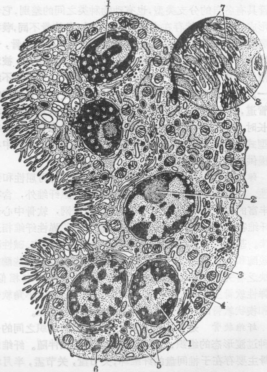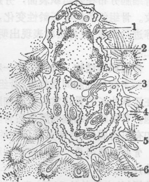 图1 成骨细胞电镜模式图 1.线粒体 2.粗面内质网 3.高尔基复合体 4.类骨质 5.突起 6.骨质 (3) 骨原细胞: 是骨细胞系的干细胞,具有分裂分化潜能,呈梭形,有细小指状突起。核椭圆形,着色浅。胞质弱嗜碱性或弱嗜酸性,含有糖原,线粒体少,高尔基复合体和内质网不发达,当分化为成骨细胞时粗面内质网增加,糖原减少。骨原细胞存在于骨内膜和骨外膜的最深层。在骨发生、生长、改建或修复过程中骨原细胞分裂繁殖,衍变为成骨细胞。 (4)破骨细胞: 是多核的大细胞,位于骨的吸收面,胞体直径20~100μm,胞核由数个至50个以上,呈卵圆形,含1~2个核仁。胞质弱嗜碱性或嗜酸性,随细胞的机能状态及成熟程度而异,一般有很强的酸性磷酸酶活性。电镜下,胞质内含有丰富的线粒体,散在的粗面内质网,较多的游离核糖体,大量空泡和溶酶体等(图2)。与骨质接触面胞膜内陷形成很多极不整齐的皱褶,称皱褶缘。这种结构是破骨细胞进行重吸收骨质时最为活跃的部分。沿皱褶缘胞膜及皱褶缘与骨质之间,显有强的ATP酶和酸性磷酸酶活性。在皱褶缘周围有一环形胞质区,称亮区,含大量微丝,几无其它细胞器。亮区胞膜平整,紧贴骨质表面,将皱褶缘区与细胞外间隙隔开,形成骨重吸收区的特殊环境。破骨细胞进行骨重吸收的机理尚不完全了解。有人认为破骨细胞释放溶酶体酶,使局部微环境呈酸性,由不同的酸性水解酶使骨质溶解。被溶解处的骨质表面常形成浅凹,称Howship陷窝,破骨细胞位于此凹内。关于破骨细胞的来源,意见不一,近年一些研究认为是由单核细胞融合而成。某些激素对破骨细胞的活动有明显影响,如甲状旁腺激素可使破骨细胞数量增多,并刺激破骨细胞积极进行溶骨活动;降钙素则抑制破骨细胞活动,并使其体积变小,皱褶缘消失。