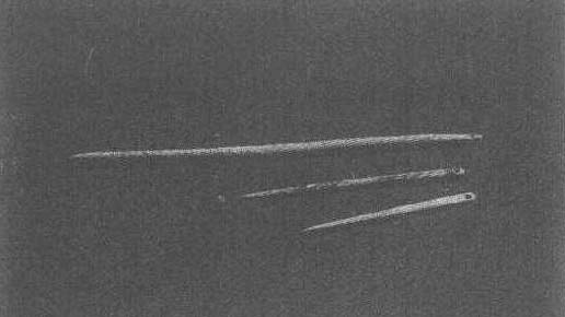 图102 骨针❶新石器时代生活用具。1976年旅顺铁山镇郭家村遗址出土。长5、直径0.12厘米。中间微粗,尖顶。顶端有一小针孔,刚能引过细线。制作精致,晶莹半透明,为骨针中精品。表明古代人们的制作技术达到一定水平。现藏旅顺博物馆。 骨针 骨针新石器时代。1978年出土于西藏自治区昌都城卡若遗址。西藏自治区文物管理委员会藏。计有长短粗细不同的骨针26件,最长的10.8厘米,最短的1.3厘米。依形制可以分为两种,一种为一端有锋利的针尖,另一端有细小的针孔;另一种为两端均磨成针尖。这些骨针磨制得相当精细,表现了卡若人精湛的磨制技术水平。卡若遗址地处海拔3100米的山地丘陵上,为距今四、五千年的新石器时代文化遗存地。其出土的骨制品有锥、针、骨饰、簪等。特征是磨制精细。除此外,遗址中还出土了石器、陶器、动物骨骼等,并发现了房屋遗迹。它的发现与发掘,对研究西藏地区的原始文化具有重要意义。