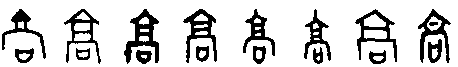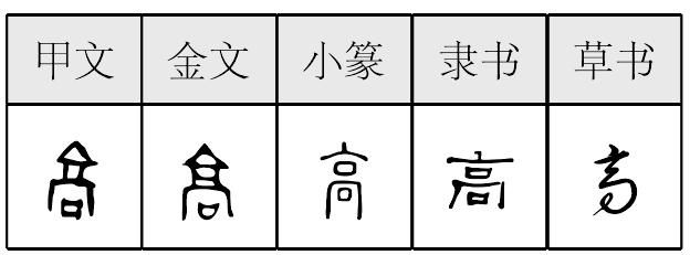 ❹ 步步登高|肥遁鸣高|福寿年高|劳苦功高|水涨船高|心比天高|月黑风高|自命清高|自视甚高|钻坚仰高 高高,甲骨文作  ,金文作 ,小篆作 。 甲骨文从京,而增 “口”爲分化符號,京亦聲。“高” 以高大建築之形表示高大之義,由高大引申爲尊貴等義。用爲動詞,有推崇、敬重義。以具體之象表示抽象之義,是漢字以形表義一法。由具體意義引申爲抽象意義,是詞義擴展一法。悟得此理,於識字明義大有裨益。卜辭或用崇高義,或用爲地名。銘文多用崇高義。 楚簡帛文作 ,已表現出明顯的書寫形態。秦簡牘文作 ,古隸典型。 高gāo (甲) (篆) 象形字,甲骨文像一个二层楼阁,小篆加了窗(或门)。作声符生成的字有: gao 阴平:篙(竹篙) 膏(牙膏) 上声:稿(草稿) 搞(搞笑) 镐(刨土工具,洋镐) 缟(古代的一种白绢) 暠(白也;另读hào) kào 犒(犒赏) hao 阴平:蒿(万家墨面没蒿莱) 嚆(呼叫。《集韵》:“吴人谓叫呼为嚆。”)< 阳平:毫(毫毛) 豪(豪放) 壕(壕沟) 嚎(嚎啕,同“号啕”) 濠(水名,在安徽) 蠔(简化为“蚝”) 去声:镐(镐京,西周初的国都) 鄗(古县名,在河北) 滈(水名,在陕西) 暠(同“皓”) qiāo 敲(敲打) 相关链接 “搞”,《集韵》中与“敲”、“靠”通。夏衍先生赋予“搞”字以新意(参见夏衍《懒寻旧梦录》)。