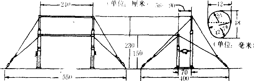 高低杠 高低杠教学和训练用的一种女子体操器械。标准高低杠是由固定在不同高度支柱上的两根横杠组成。横杠长240厘米,高杠高230厘米,低杠高150厘米,两杠立柱间安装有调整器,可以调整两杠间的宽度。有8条尼龙钢丝绳拉链,链上有调整松紧的装置,为了拴锁尼龙绳和保证杠面安装牢固,在横杠两端安有厚为0.2厘米、长为10厘米的钢管,横杠是由弹性木质或玻璃钢制成,以保证完成各种高难动作。