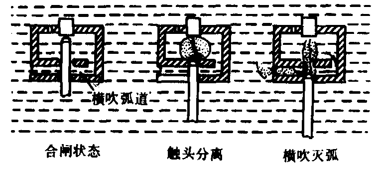 图3 简单油横吹灭弧室及其灭弧过程示意