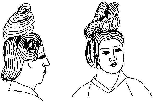 《簪花仕女图》中高髻 ☚ 垂髻 5、佩饰 ☛ 高髻见“椎髻”(2164页)。 高髻汉代都市妇女一种时髦发式。东汉有“城中好高髻,四方高一尺”之谚(《后汉书·马廖传》)。此髻高绾发髻于关顶,梳理繁难,虽一度时髦,终未普及。 |