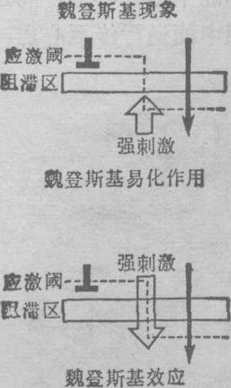 | 释义 | 魏登斯基现象Wedensky phenomenon指处于抑制状态的心脏传导组织,在接受一次强刺激后可改善其传递冲动的能力的一种现象。它包括魏登斯基易化作用及魏登斯基效应两部分。前者可使心脏传导功能得到暂时性改善,后者使其传导能力得以继续维持。因而使一部分心室停顿患者从濒死威胁中得到暂时的解救。 魏登斯基现象 魏登斯基现象魏登斯基现象(Wedensky phenomenon)分为魏登斯基易化作用 (Wedensky facilitation)和魏登斯基效应(Wedensky effect)两类。魏登斯基易化作用是原来处于抑制状态的传导组织,在接受一次强刺激后,使原来受阻的向下冲动得以通过。魏登斯基效应是指一次强刺激突破阻滞区下传后,随后而来的同侧阈下冲动能通过该阻滞区(图1)。