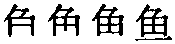 【提示】田,中间的横宋体与左右两边相接,楷体与左右两边相离。 *鱼(魚)yú8画 鱼部 (1) 生活在水里的一类脊椎动物。靠鳍游水,靠腮呼吸。多数有鳞、有鳔。种类极多: 鲤~|捕~|热带~。 (2) 指一些水生动物: 鲸~|甲~|鱿~|鳄~。 鱼魚yú原始文字象鱼形,横写。如原始社会晚期仰韶文化的陶文。甲骨文和西周早期仍象鱼形,但因文字成句,直行,需节省地位,改为竖写,如虎象犬豕等字。西周中期以后,逐渐文字化,鱼头象一撇一折,鱼尾象火字。隶书逐渐作四横点,腹部像田字。约东汉以后作鱼。唐代以后行草书把四横点连写作一横,成鱼,现作规范字。见《总表》。鱼是脊椎动物的一类,生活在水中,通常有鳞和鳍,用鳃呼吸,体温随外界温度而变化,种类很多。大部分可供食用或制鱼胶。 鱼魚★繁◎常★常