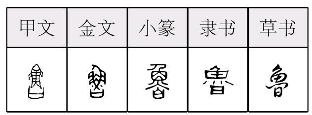 鲁魯lǔ(12画) *鲁(魯)lǔ12画 鱼部 鲁魯lǔ甲骨文从鱼(魚)在食器上,嘉美,嘉善义。西周以后金文食器中常增一短横画,就是“甘”字。 少数鱼尾和“口”搭连,成“ 鲁魯★繁◎常★常