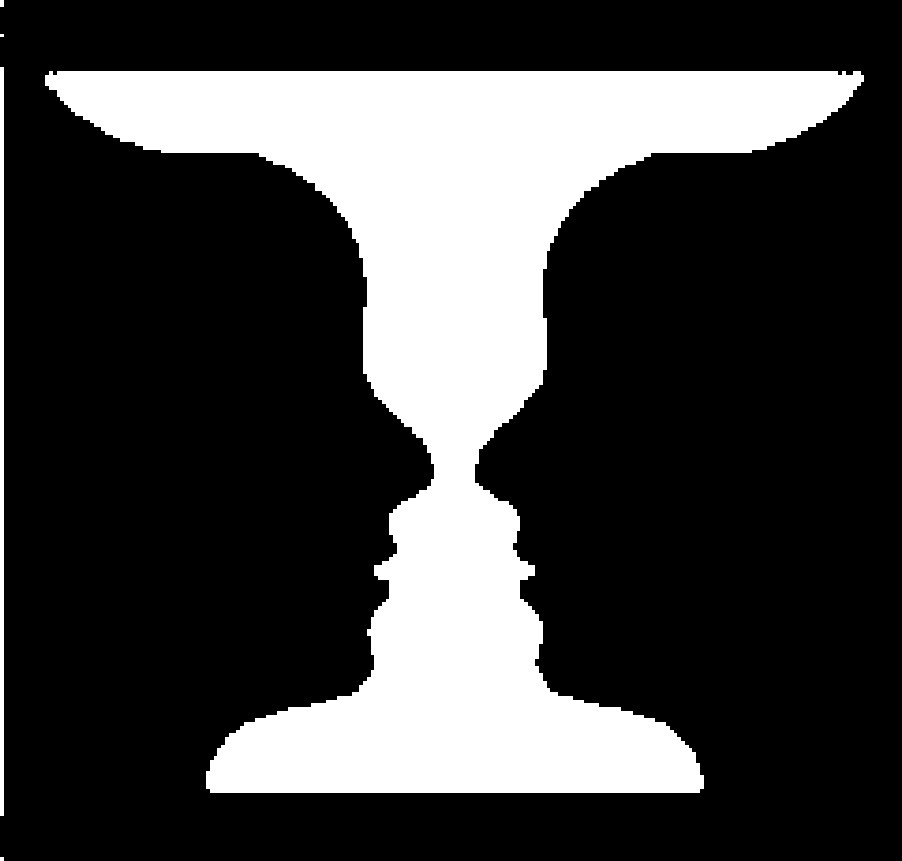 | 释义 | 鲁宾酒杯-人面图 鲁宾酒杯-人面图Rubin's goblet profile figure亦称“花瓶与人脸交变图”。知觉的对象和背景可以互相转换的图形。丹麦心理学家鲁宾发现。常用来说明知觉的选择性,下图可以被知觉为酒杯(以黑色部分为背景,白色部分为对象),也可以被知觉为人面(以白色部分为背景,黑色部分为对象)。