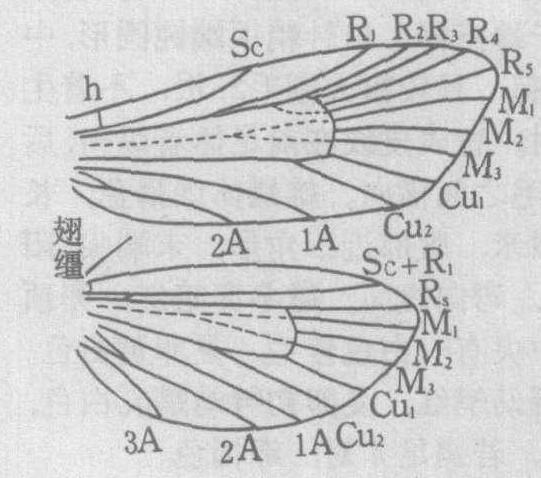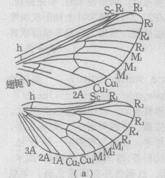 成虫 蝶类与蛾类的主要区别表现在:蝶类触角棍棒状,体色大都鲜艳,多白天活动,静止时翅直立背上,翅连锁属翅抱型,蛹为垂蛹或带蛹。蛾类触角羽状、栉状、齿状或丝状,体色暗,常在夜晚活动,翅连锁多属翅缰型,少数为翅轭型或翅抱型。蛹在地下、茎梢中或茧中,为被蛹。 本目共同特征为:成虫翅、身体和附肢上布满鳞片。头部多呈圆球形,有一对发达的复眼和两个单眼。虹吸式口器,下颚特化成喙,上颚在绝大多数种类中均消失。下唇须发达,分为3节,其大小及形状往往是性别和种类识别的依据。胸部一般有两对膜质翅,前翅多比后翅大。翅的形状(图1)在各科中常有变异,可用以辨别类群。脉序的特点为: 前、后翅中脉(M)主干消失形成一中室。前翅脉序为亚前缘脉(Sc)1支、径脉(R)5支、中脉(M)3支、肘脉(Cu)2支、臀脉(A)3支,1A常退化,2A和3A共柄或合并,共12支。由于后翅脉序的变异而分为同脉亚目和异脉亚目。前者前、后翅脉序相同; 后者后翅只有8支翅脉或更少,其中径脉的R1和Sc脉合并,Rs脉单一。同脉亚目前、后翅间的连锁器为翅轭型,包括少数比较原始的蛾类。异脉亚目中绝大多数蛾类为翅缰型,蝶类和枯叶蛾、天蚕蛾等则为翅抱型。前翅花纹多变,也是识别种类的重要依据,现举夜蛾前翅模式(图2)供参考。