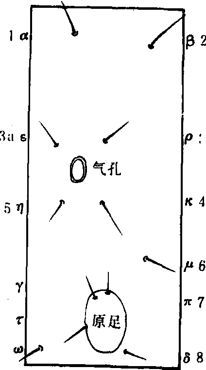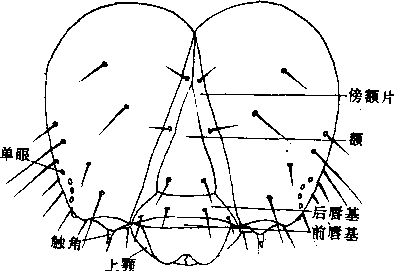 卵 大致可分为两类:一类为卵圆形或扁圆形,其长轴与胶着物体平行,卵壳表面仅有粗凹刻,稀有纵行条纹;另一类卵竖立呈瓶形,球形或半球形,其长轴与物体垂直,卵壳表面装饰较复杂,一般有纵肋,更可分为若干小室。卵多为绿、白或黄色,或有不同的花斑。 幼虫 俗称蠋。头部(图4)两侧各有单眼6枚,傍额片(adfrontals)为本目所特有。胸部3节,各有胸足一对,腹部10节。一般有腹足5对,生在第三至六和第十腹节上。腹足末端生有趾钩(图5),趾钩排列有单行、双行、多行,每行根据趾钩长短又可分为单序、双序、三序;排列形式又有环状、缺环、单横带、二横带及中带等。身体各节有刚毛,排列成一定的毛序(图6),是幼虫分类的重要特征。有的种类体表尚有毛瘤、毛簇、枝剌、角突等构造,例如毒蛾科、枯叶蛾科、灯蛾科、剌蛾科等幼虫。此外,凤蝶科幼虫第一胸节前方与头部分界处有可以翻缩的叉状黄色腺体,受惊时能伸出体表并散发臭气;蛱蝶科、夜蛾科及舟蛾科的一部分,在前胸腹板有一开孔能放射一种液体;毒蛾科第六和第七腹节背面有能翻缩的毒腺;灰蝶科中有的在第七腹节背面,有一横行小裂孔,能突出小球状泡; 绒蛾科腹部两侧突出物等均为不同的防御腺。幼虫多呈黄、绿、褐色,往往有若干纵行条纹,由背中央向两侧,顺次为背线、亚背线、气门上线、气门线、气门下线、基线、上腹线和腹线。