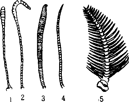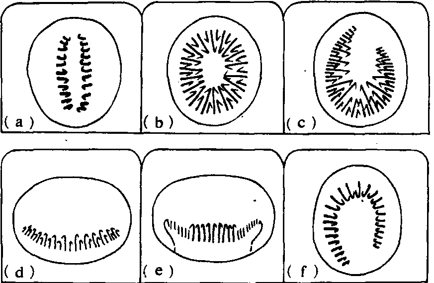 图5 鳞翅目幼虫趾钩类型 (a)二横带; (b)双序环; (c)三序缺环; (d)双序中带(e)单序中带; (f)单序缺环 (仿A. Peterson)