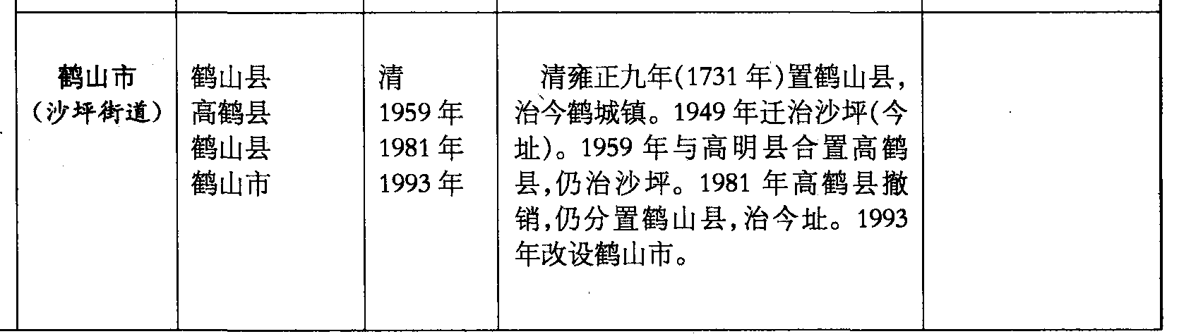 鹤山市(沙坪街道)鹤山县高鹤县鹤山县鹤山市清1959年1981年1993年清雍正九年(1731年)置鹤山县,治今鹤城镇。1949年迁治沙坪(今址)。1959年与高明县合置高鹤县,仍治沙坪。1981年高鹤县撤销,仍分置鹤山县,治今址。1993年改设鹤山市。