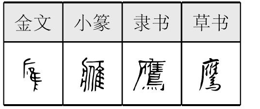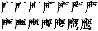 yīnɡ金文形声,从隹,人声,小篆添加音符疒(从瘖省),隶定为“ ”。鸟名。后作“鷹”,形声,从鳥,應省声。《简化字表》把“鷹”类推简作“鹰”。 |