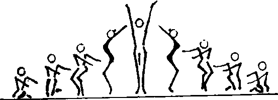 图1 2.动作:每人从预备姿势开始,按波浪动作的规律做身体起伏动作,同时手臂按顺时针方向做绕环动作,可以4拍为一动作循环,也可以8拍为一动作循环(图2)。 麦浪动作训练方法:1.以一个浪峰为单位练习手臂动作。2.臂绕环与身体起伏动作配合。3.全体配合练习。