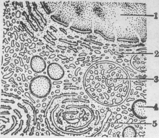 图2 妊娠9周粒黄体细胞超微结构 1.细胞核 2.滑面内质网 3.线粒体 4.脂滴 5.粗面内质网 妊娠黄体 如排出的卵受精,黄体在黄体生成素和胎盘分泌的绒毛膜促性腺激素的作用下继续长大,形成妊娠黄体。妊娠黄体到妊娠3个月时直径可达5cm,存在6个月左右,以后逐渐退化,分娩后退化加快,最后也为白体替代。妊娠后期黄体分泌松弛素,有抑制妊娠子宫平滑肌收缩,分娩时促进宫颈扩张和使耻骨连合松弛等作用。 ☚ 卵泡的发育与排卵 输卵管 ☛ 黄体corpus luteum |