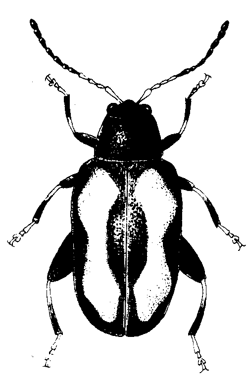黄曲条跳甲成虫体长1.8~2.4毫米,黑色光亮,触角基部3节及跗节深棕色,鞘翅中央有一黄纵条,纵条的外缘中部凹曲颇深,内缘中部直,仅前后两端向内弯曲。额顶仅限两复眼后缘以前部分布有深刻点;触角间隆起,脊纹狭隘显著; 触角基部颇长大,其余以第五节最长,约为第四节的2倍,第六节最短小; 雄虫触角第四、五节特别膨大粗壮。前胸表面布有深密刻点,小盾片甚光滑,鞘翅上刻点多排列成行(见图)。幼虫长圆筒形,末龄幼虫长约4毫米; 头部、前胸盾及臀板淡褐,胸、腹部乳白,各体节均有不很突出的肉瘤。头部隐于前胸下,翅芽及足伸达第五腹节,各体节背面有稀疏褐色刚毛; 腹末有一对叉状突起,叉端色褐。黄曲条跳甲在华北和东北年生4~5代,华东4~6代,华中5~7代,华南7~8代,以成虫越冬,无滞育现象,华南可终年发生。越冬场所多在残株落叶下及杂草、土缝间,南向的菜行中越冬虫量比北向菜行多。越冬成虫在春天温度回升到10℃左右时恢复活动和取食: 辽宁兴城在4月,杭州在3月,日本在2月末。成虫善跳跃,高温时能飞,但飞翔能力不强,中午前后活动力强,夜有趋光性,对黑光灯敏感。成虫10℃左右开始少量取食,15℃食量渐增,20℃时急增,32~34℃食量最大,超过34℃又趋下降,温度再升高则入土越夏。在非蛰伏期,禁食3日即死,若供水则可维持6~7天。成虫产卵期可绵延1~1.5个月,故常世代重叠。产卵时多在晴天午后,散产在离主根3厘米内,大多在1厘米深的土壤中,也可附于须根上或在近土面的茎上咬孔产卵。越冬代成虫产卵量最大,每雌可产621粒之多,第一、二代仅20余粒。卵发育起点12℃,最适温26℃左右。相对湿度达100%才能孵化。卵期3~9天。幼虫由须根食向主根,剥食根皮。其土栖深度萝卜为4~5厘米,最深达12厘米; 白菜类为3~4厘米。幼虫分3龄,发育起点温度为11℃,幼虫期11~16天不等。末龄幼虫多在3~7厘米深的土中作土室化蛹,发育起点11℃,前蛹期2~12天,蛹期3~17天。从始卵至羽化成虫出土,少则19天,多则54天。为害性由北向南渐逐加大,南方有春、秋两次较大为害,华北、东北则秋季较春季稍重。 常年为害地区应注意清除杂草及残株落叶以消灭越冬成虫;整地时可深耕晒土,杀死部分幼虫和蛹;移苗时若发现根部有幼虫,可用敌百虫液浸根; 地上部受成虫为害时,用敌百虫、敌敌畏、马拉硫磷、杀螟腈液喷雾。1%的敌稻瘟水溶液对黄条跳甲类有强烈的诱集作用,可供诱杀及测报之用。 |