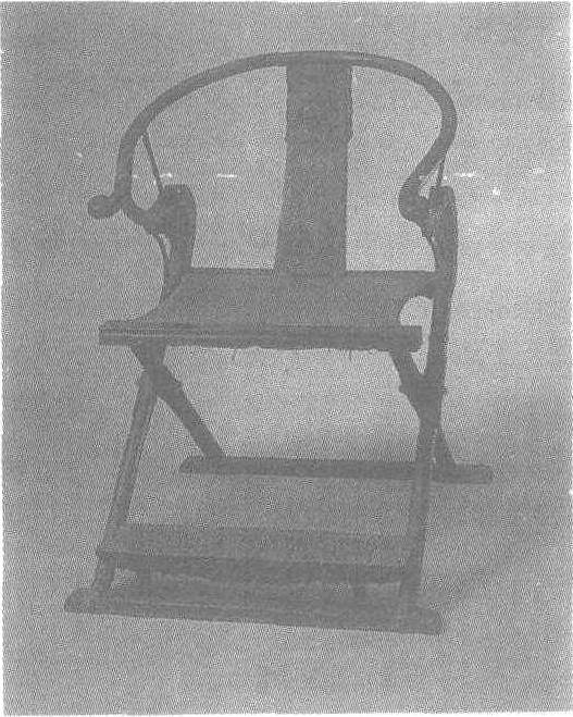 明。面长69.5厘米,宽47.5厘米,通高104厘米。北京故宫博物院藏。圈椅式圆背扶手,扶手头向外侧旋转成扁圆状。软屉、足下设长条形托泥,并置一踏床,可翻转、拆卸、自由使用。背板上部刻一由双螭构成的如意头纹。扶手、腿、足与托泥等交构处均由铁饰件进行加固。此椅是明代交椅的基本样式,纹饰、图案亦为明式家具中最常见的。