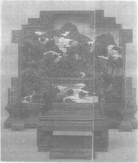 清乾隆三十六年(公元1771年)重修宁寿宫时精制的成堂家具。北京故宫博物院藏。屏宽212厘米,高172厘米。台阶式顶,十字形云纹足,下有卷云足束腰托泥。宝座宽96厘米,深69厘米,座高50厘米,通高98厘米。三扇屏风式围子,束腰,内卷蹄足,下设托泥,附踏床。屏心、座背板天青色油地上,由鸂鶒木、染色象牙、玉石及骨料等镶嵌一幅由蓝天、云海、山峦茂林、琼楼玉宇、人物溪流等构成的景物图。远近高低,虚虚实实,颇具仙境的意味,令人赏心悦目。