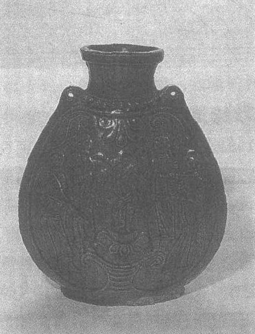 古代名物 > 日用類 > 宴飲部 > 貯酒器 > 黄釉瓷扁壺 黄釉瓷扁壺 huángyòucíbiǎnhú 北齊時瓷水器或酒器。高二十厘米,口徑寬五·二,長六·三厘米。1971年河南安陽縣范粹墓出土。形體扁圓,上窄下寬,敞口短頸,假圈足,無蓋。肩與頸連接處飾聯珠一周,兩肩各有一孔,似游牧民族馬或駝背上所掛之皮囊。壺身兩面均飾有“胡騰舞”圖案:正中一人婆娑起舞於蓮臺之上,左右各二人配樂伴奏,左一人撥琵琶,一人拍鈸,右一人吹笛,一人作擊掌狀,均為當時少數民族形象。畫面樸素大方,富有韻律感。通體施橘黄色釉,底部有凝脂狀釉珠。其别緻的造型和用“胡人”樂舞作裝飾的圖案,在中原地區較罕見。現藏河南省博物館。 黄釉瓷扁壶 黄釉瓷扁壶北齐武平六年(公元575年)。高19.5厘米,口径6.4厘米。1971年河南省安阳市范粹墓出土。河南省博物馆藏。此壶形体扁圆,敞口短颈,壶腹上窄下宽,肩部各有一孔,形制似北方游牧民族挂于马背的皮囊。壶的颈、肩相连处有凸起的连珠纹一周,壶腹两面饰纹相同,皆为“胡腾舞”图案。中间一人起舞于莲座之上,双脚腾跃,挥臂回首。其两侧各有二人配乐伴奏。整个场面生动活泼,相互呼应,浑然一体。五人均深目高鼻,着窄袖长袍,穿高靴,从相貌和装束看是西域人,所跳舞蹈亦具西域民族特色。这种形制和纹饰的瓷壶在中原地区出土,反映出中原与西域人民的经济文化交流。此壶的釉质色彩纯正、匀润,壶上的浮雕图案立体感十分鲜明。