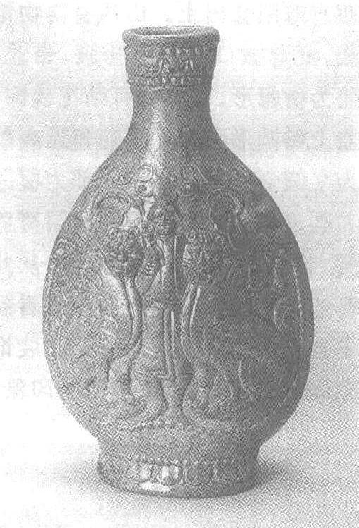 | 释义 | 黄釉胡人狮子纹瓷扁壶 黄釉胡人狮子纹瓷扁壶唐。高27.5厘米,口径5.7厘米。山西省博物馆藏。此为一胆形壶。壶腹以如意云形和连珠纹组成一圈纹饰。中间立一胡人,着胡服,高鼻深目,右手持一未开的荷花。胡人左右各有一狮:右狮闭口前视,十分安静;左狮则鼓目怒吼,十分凶猛。其身后立一小人。瓷壶的颈部和底部皆贴饰连珠纹和莲瓣纹。此壶的形制和装饰均仿自唐代具有波斯风格的银器。在唐代,中外文化交流发达,波斯等地的银器传入中国,中国的制瓷工匠吸取其精华用于瓷器制作。这件瓷壶即有波斯萨珊王朝银壶的特征,颇具异国风格,是研究中外文化交流史的重要实物资料。