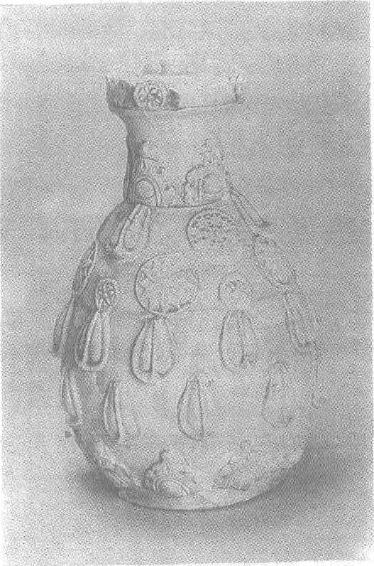 北齐。高20厘米,口径11厘米。山西省寿阳县出土。山西省博物馆藏。此尊撇口,短颈,垂腹,带盖。盖为僧帽形。尊外壁有贴花装饰:盖上贴圆形图案,颈部和近底部为半圆形图案,尊腹上部为覆莲和圆形相间图案;下饰两层覆莲瓣。施淡黄色釉,釉层均匀。从此尊的莲瓣装饰图案可明显地看到佛教艺术的影响。这种贴花装饰立体感强,给人留下鲜明的印象。