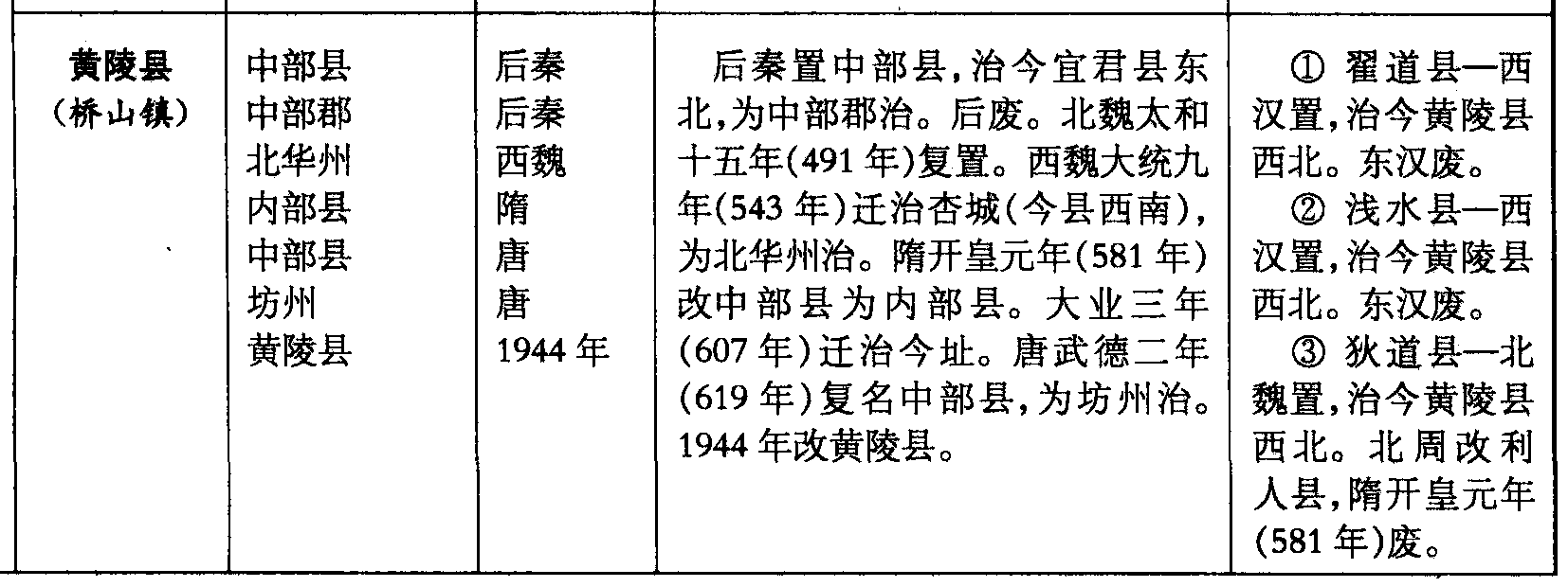 黄陵县(桥山镇)中部县中部郡北华州内部县中部县坊州黄陵县后秦后秦西魏隋唐唐1944年后秦置中部县,治今宜君县东北,为中部郡治。后废。北魏太和十五年(491年)复置。西魏大统九年(543年)迁治杏城(今县西南),为北华州治。隋开皇元年(581年)改中部县为内部县。大业三年(607年)迁治今址。唐武德二年(619年)复名中部县,为坊州治。1944年改黄陵县。❶ 翟道县—西汉置,治今黄陵县西北。东汉废。❷ 浅水县—西汉置,治今黄陵县西北。东汉废。❸ 狄道县—北魏置,治今黄陵县西北。北周改利人县,隋开皇元年(581年)废。
