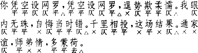 黄龙衮 黄龙衮吴伟业 《秣陵春》  全曲十句:5 △叠5 △,5 △。4,5 △。4,4 △。3,3,3 △。首句有不叠者,如《玉玦记·接诏》、《昙花记·公子受封》、《牡丹亭·欢挠》、《邯郸记·骄宴》、《明珠记·由房》。第四、五句有作五字、七字句者,如《杀狗记·看书苦谏》、《拜月亭·招商谐偶》、《赠书记·保母识女》,作者不多。此外如《蕉帕记·防险》末三字句第一句叠;《玉合记·逢世》末三字三句,众重唱一遍,盖和声也。《西厢记·情传锦字》连用五支,第一支多“睡昏昏”、“意悬悬”二句,《南音三籁》卷三收此套,其眉批已指出。〔黄龙衮〕率用在〔降黄龙〕之后,连用二支或四支,《西厢记》连用五支成套。独立叠用四支成套,只见《白兔记·祭赛》一例,盖早期用法。〔黄龙衮〕一作〔黄龙滚〕,一单作〔衮〕,或〔衮遍〕、〔花滚〕。《双烈记·受职》作〔降黄龙滚〕,“降”字误衍。《白兔记》词式微异。 ☚ 降黄龙 出队子 ☛ 00007560 |