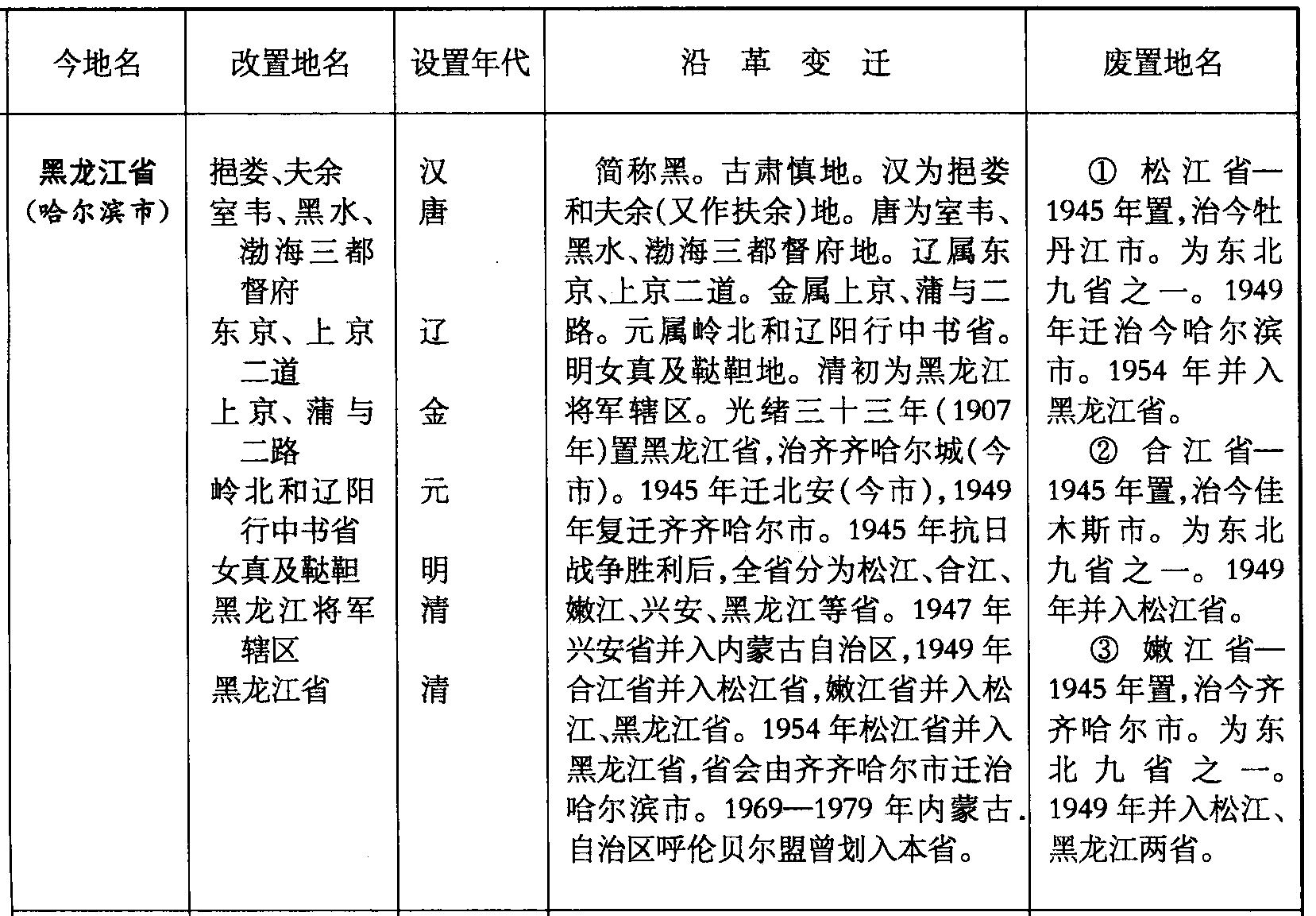 简称黑。古肃慎地。汉为挹娄和夫余(又作扶余)地。唐为室韦、黑水、渤海三都督府地。辽属东京、上京二道。金属上京、蒲与二路。元属岭北和辽阳行中书省。明女真及鞑靼地。清初为黑龙江将军辖区。光绪三十三年(1907年)置黑龙江省,治齐齐哈尔城(今市)。1945年迁北安(今市),1949年复迁齐齐哈尔市。1945年抗日战争胜利后,全省分为松江、合江、嫩江、兴安、黑龙江等省。1947年兴安省并入内蒙古自治区,1949年合江省并入松江省,嫩江省并入松江、黑龙江省。1954年松江省并入黑龙江省,省会由齐齐哈尔市迁治哈尔滨市。1969—1979年内蒙古自治区呼伦贝尔盟曾划入本省。
