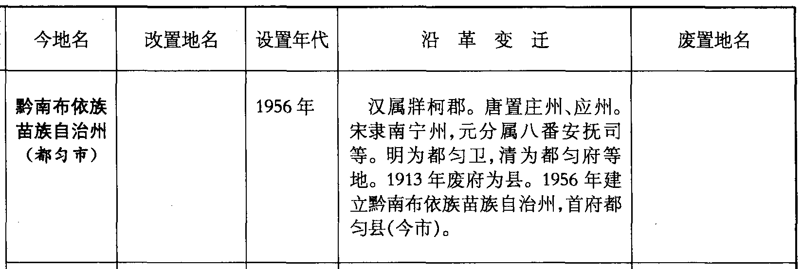 黔南布依族苗族自治州(都匀市)1956年汉属牂柯郡。唐置庄州、应州。宋隶南宁州,元分属八番安抚司等。明为都匀卫,清为都匀府等地。1913年废府为县。1956年建立黔南布依族苗族自治州,首府都匀县(今市)。