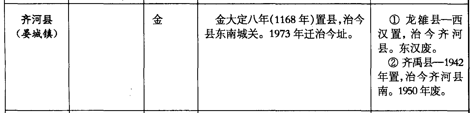齐河县(晏城镇)金金大定八年(1168年)置县,治今县东南城关。1973年迁治今址。❶ 龙𨿅县—西汉置,治今齐河县。东汉废。❷齐禹县—1942年置,治今齐河县南。1950年废。