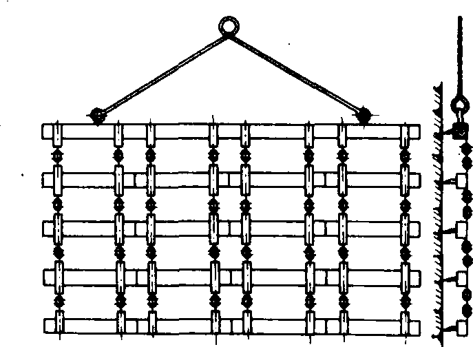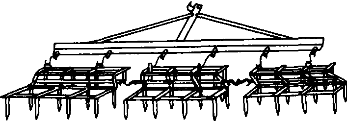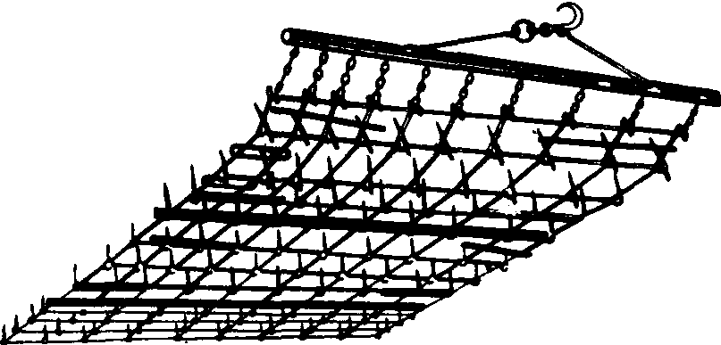 图1 钉齿耙 耙齿的断面有圆形、方形和刀形等。圆形耙齿常用于轻型耙。方形耙齿广泛用于重型和中型钉齿耙。刀形耙齿切碎力强。耙齿的长度一般为耙深的2~2.5倍。 中国黑龙江地区用的软架耙(图2)在前进方向能够随地面仿形,使耙深较为一致。 网状耙 耙齿采用弹簧钢丝(图3)制成。耙架也是由耙齿的钢丝上部弯过来互相铰连而成网状,因此在纵向和横向都具有较好的地形适应性。