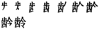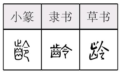 龄齡líng(13画) *龄(齡)líng13画 齿部 龄齡líng甲骨文以来有“令”。象人在屋下发号施令。约东周时用为年龄的龄。中古时造龄字,加齿旁。齿字甲骨文至战国文字从口,象口内有齿形。战国晚期因形略变较难认,加“止”表声。小篆以后都从象形的“齿”,从“止”声。小篆以后的齿字作齒。下部里面四个小“人”字象齿形。现在群众简化作齿。从一“人”,简单易学易用。现作规范字。见《总表》。偏旁类推齡简化作龄。指岁数。如:高龄。组词如:年龄。引申为年数。如:工龄|党龄。 龄齡★繁◎常★常