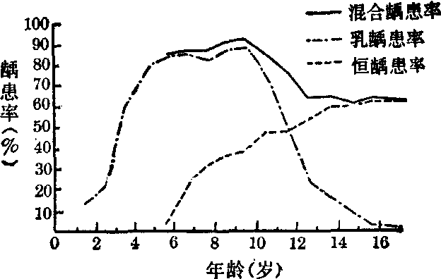 致病因素 龋齿是可以预防的,关键是弄清致病因素,以做到有的放矢地预防。目前公认龋齿的发生与下列三个主要因素有关。 (1) 口腔中细菌的破坏作用:实验证明,局部没有细菌就不可能有龋齿。导致龋齿的细菌主要为变形链球菌和乳酸杆菌。它们在口腔的残留食物上繁殖产酸,在一定酸度下(如pH5)作用一定时间后就能腐蚀人体最坚硬的组织——牙釉质,形成龋洞。 (2) 牙面牙缝中的食物残渣是产生龋齿的必要条件之一: 在住宿学校中观察不同膳食对龋齿发生的影响。将学生分成三组: 一组吃普通膳食,作为对照组; 二组吃同样膳食加一定量的糖; 三组吃同样的膳食加同样量的糖,但做成粘点心。一年后检查的结果是: 一组的新发龋最少,二组多于一组,三组则更明显地多于二组。实验证明留在牙面牙缝的食物残渣,尤其是糖、粘点心是造成龋齿的重要因素之一。 (3) 牙齿的抗酸能力: 近年来实验证明氟是促进抗龋能力的最主要的微量元素。氟在人体中主要储存在骨胳和牙齿中,尤其在牙釉质内。牙釉质内含氟量达一定高度时抗腐蚀能力强,含氟低则容易受酸腐蚀。牙釉质含氟的多少决定于每日氟的摄入量。氟的来源主要是水和食物。儿童每日氟的摄入量主要来自饮水(见表)。卫生部在1973年规定我国饮用水含氟化物以不超过1.0mg/L为限,适宜浓度为0.5~1.0mg/L。但目前许多地方水源含氟较低。如对海淀区东升人民公社各处水源的测定,水的含氟量除一个点达0.5mg/L之外,其余十数个点的含氟量均波动在0.1~0.2mg/L之间,远远低于上述饮水中含氟量的要求。 (4) 口腔的其他环境条件: 如唾液量的多少、稀稠度及酸碱度的不同与龋齿发生也都有一定关系,而牙齿排列不齐,便于食物残渣和细菌的存留,也会促使龋齿的产生。 摄入氟的主要来源