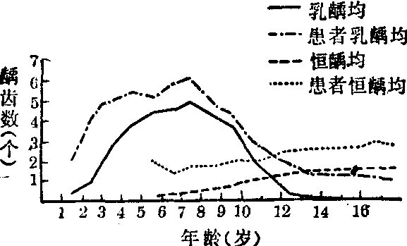 图1 龋患率与年龄的关系(据北京医学院三院口腔科等,1973) 龋均及患者龋均 计算龋均是将受检儿童的龋齿数除以受检儿童人数,据此可了解学龄儿童中龋齿的平均数,以说明其严重情况。计算患者龋均是将受检儿童的龋齿数除以有龋齿的儿童数,据此可估计需要治疗者的龋齿数目,以便估计及安排治疗日程及人力、物力等。从龋均与年龄关系(图2)可以看出,乳龋均和患者乳龋均都是在幼儿园和小学最高,中学最低。恒龋均和患者恒龋均则是中学最高,小学次之,幼儿园最低。