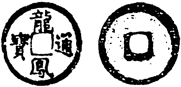 元末劉福通、韓林兒起義軍定都亳州建元“龍鳳”(公元1355—1366年)時鑄。有小平、折二、折三凡三等,面文真書,直讀;文字秀麗,鑄製工整,背光無文。小平徑約二·三厘米,重三克左右。折三有徑達三·四厘米之大樣者,或謂係折五。今大小諸品均罕。《茶巖逸考》:“至正十五年,潁州人劉福通據亳州,立韓林兒爲帝,僭號宋,改元龍鳳,鑄錢曰‘龍鳳通寳’。”