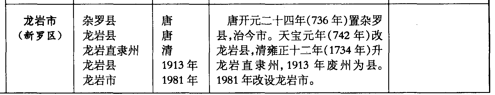 龙岩市(新罗区)杂罗县龙岩县龙岩直隶州龙岩县龙岩市唐唐清1913年1981年唐开元二十四年(736年)置杂罗县,治今市。天宝元年(742年)改龙岩县,清雍正十二年(1734年)升龙岩直隶州,1913年废州为县。1981年改设龙岩市。