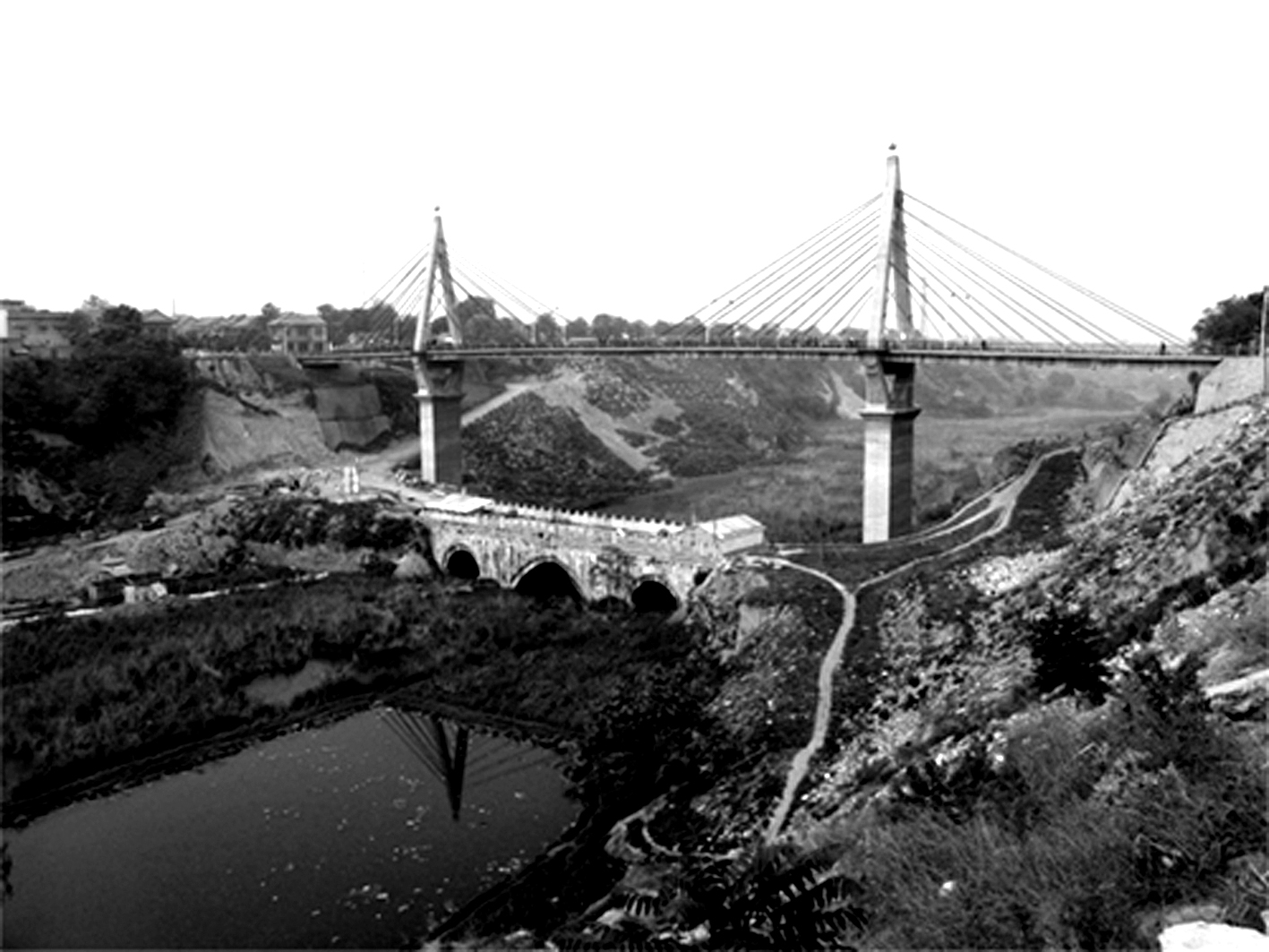 位于三原县城关镇北侧。厚蹲三联拱石桥。又称崇仁桥。始建于明万历二十年(1592),三十一年(1603)竣工。知县高进孝创建,邑绅温纯捐资续建而成。桥南原有“高公祠”,桥北有“温公祠”。清康熙、乾隆、嘉庆、道光、咸丰年间修葺。南北走向,跨清河上。全长54.5米,宽10.95米。此桥采用多孔券拱式,共有3孔,中间一孔大,两边两孔小。三孔不等跨,中孔为尖形拱顶,净跨17.5米,矢高10.55米;两边孔半圆拱,净跨7.4米。大小拱券石厚约0.85米,桥墩宽5.15米,上下游方向均设有长3.85米、宽5.04米的分水尖。全桥为石构铁钳,大青石铺砌桥面,两侧栏板浮雕各式人物、花卉及瑞兽图案。整个桥身用长方形青石块筑成,造型宏伟,坚实美观,保存完整。据诸志中记,明万历四十四年(1616)夏及1933年,洪水越桥而过,桥身未受损。兹为西北地区著名的古桥之一。1992年公布为陕西省重点文物保护单位。