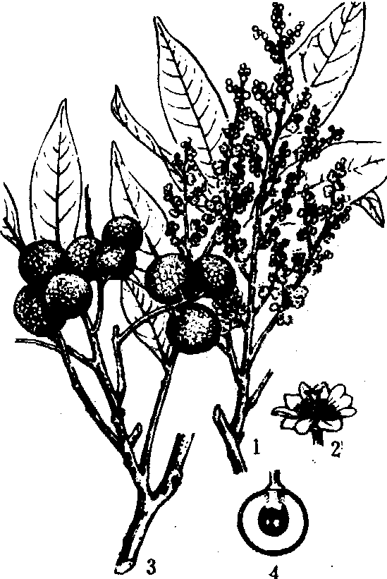 龙 眼 1. 花枝; 2. 花; 3. 果枝; 4. 果实纵剖面 根系在年周期生长中有3~4个高峰, 新根和新梢生长互相交替, 6月至8月高温多湿, 根系生长量最多。每年抽梢3~4次, 即春、秋梢各1次, 夏梢1~2次(夏梢有时可抽3次), 新梢多由已充实的枝梢顶芽延生, 亦有从短截枝上或不定芽抽出。龙眼属当年花芽分化当年开花结果的类型, 2月至4月花芽形态分化, 4月至5月开花,单株花期约30~45天, 单花丛的雌雄花交替或交错开放。坐果率约为雌花的10~20%。龙眼授粉后3~20天落果最多, 为第一次生理落果, 6月中旬至7月中旬为第二次生理落果, 以后直至成熟落果较少。果实增大有3个生长高峰, 增长最快在中后期(7月上旬以后)。一般成熟期在8月至9月。 龙眼性喜温, 年平均温度20~22℃较为适宜, 冬季绝对低温低于-5℃的地区, 不宜栽培。花芽分化需要有一段相对低温最冷月均温12℃左右,较耐旱,华南亚热带地区的年降雨量通常能满足其生长结果的需要, 但花期及幼果期多雨常导致落花落果, 应及时排水。果熟期要注意防台风。龙眼对土壤适应性颇强,但以土层深厚, pH值4.5~6.5的沙壤土域壤土为佳。 主要品种 中国龙眼品种资源丰富, 其中以福建省最多, 次为台湾、广东、广西。福建栽培最多的品种为❶福眼。该品种适应性较强, 产量高, 果大, 皮较薄,品质中, 适于罐装、鲜食和焙干。 ❷乌龙岭。是福建重要主栽品种, 产量高, 果大, 含糖量高, 品质中上,焙干率高。 ❸东壁。系著名稀优品种, 较丰产,果较大, 肉厚, 质脆, 浓甜, 有香气, 含糖量高, 品质极上, 为鲜食良种。此外, 赤壳、水涨、油潭本、普明庵、大鼻龙、栖本、蕉眼、红核子也是福建较重要的品种。广东最主要的品种为石硖, 丰产,果中等大,皮较薄, 含糖量高, 肉较厚, 爽脆, 品质优, 适于鲜食和制干。较重要的品种还有脆肉、乌圆、双孖木、大广眼、草铺种、秋风子、顶圆、大个圆。台湾主要品种有麒麟坑早生、圆粉壳、乌粉壳、凤梨味、十月龙眼、白杷早生、龙目、牛栏种。广西主要品种有大乌圆、下对龙眼、冰糖肉、广眼、博白龙眼。由于各地长期沿用实生繁殖, 还有不少优良类型或株系。 栽培技术要点 繁殖方法以高压条和嫁接为主。福建高压繁殖的历史悠久, 苗木具有品种纯正、生长快、结果早的特点, 但繁殖系数低。嫁接法主要有高位舌接、切接、靠接, 嫁接成活率高。近年各地推广应用小苗嫁接法如芽片切接、长枝腹接等,效果好,可提高苗木的繁殖系数。 龙眼园地宜选南向, 丘陵山地修筑水平梯田, 株行距5~8米。一般春、秋季定植, 有霜害地区以春植为宜。幼年果园可间种速生短期果树、豆科作物或其他经济作物。幼树整形主干高度以60~100厘米为宜;选3~4条生长健壮分布均匀的枝条留作主枝, 并培养成圆头形树冠。成年树年施肥5次: 在抽穗前; 疏花穗后至开花前;疏果后;果肉迅速膨大期; 采果后。施肥量通常按每产果50~100千克,全年施纯氮(N)1~2千克, 磷(P2O5)0.5~1千克,钾(K2O)1~1.5千克, 应重视有机肥的施用, 配合适量化肥。成年果园每年浅耕3~4次,于8月至9月及1月至2月进行犂翻,采果后深翻结合培土,每株培土约0.5吨。夏秋旱期结果树要注意灌水,以提高产量,并促进秋梢萌发。成年树的修剪,以保持树势健壮和培养优良结果母枝为原则,分别在春、夏、秋季进行, 将过密、衰弱、病虫、杂乱枝疏除。 龙眼大小年结果现象较为明显。对开花结果多的植株, 适时适量疏去部分花穗和果实, 促进在开花结果的同时, 有一定数量强壮的夏梢抽生, 作为翌年开花结果的母枝。疏折花穗宜在花穗抽生12~15厘米时进行, 福建以4月上、中旬为宜。花穗疏折量约50~70%, 疏折原则是:“树顶少留, 下层多留,外围少留,内部多留,去龙留副(龙即龙头穗, 是突出树冠外面枝条顶端的花穗; 副是生长次强的侧生花穗), 折上留下”。同时,把病穗、弱穗和带叶发育不良花穗疏去。所留花穗必须均匀分布。疏果多在6月进行, 疏剪密生果、并蒂果、病虫果、畸形果。 龙眼害虫以荔枝蝽象和爻纹细蛾、卷叶蛾、桃蛀螟、荔枝灰蝶等果蛀虫类最为重要。病害以丛枝病为主要的危险性病害, 对生产影响较大, 其次有叶斑病类、煤病类、果腐病类、根、茎病类等。 经济价值 龙眼是中国南亚热带著名的特产水果。果肉含糖量高达12~23%, 维生素C和维生素K的含量也很高, 每100克果肉含维生素C43.1~163.7毫克, 维生素K196.5毫克。除供鲜食外, 可焙制桂圆干, 具有补心益脾、养血安神等药效, 深受国内外消费者欢迎, 为重要出口商品, 畅销东南亚一带。果实还可加工制糖水罐头及龙眼膏, 果核含淀粉量高, 可供酿酒。木材坚硬耐久, 纹理细致, 是高级用材。 龙眼longanDimocarpus longan,别名桂圆、益智。无患子科龙眼属常绿乔木。染色体数2n=30。国家三级重点保护植物。栽培历史悠久,《本草经》、《西京杂记》及《后汉书》等均有记载。高达15m,树皮粗糙,薄片状剥落。幼枝被锈色柔毛。偶数羽状复叶互生,小叶6~12,长椭圆形或长椭圆状披针形,长6~20cm,全缘。圆锥花序,花杂性,黄白色,径4~5mm,花期4~5月。核果圆球形,外皮黄褐色,种子黑褐色,具白色肉质假种皮,果期8~9月。栽培品种甚多。产中国台湾、福建、广东、广西、海南、云南及四川等地,越南、泰国、缅甸也有分布,日本有引种。喜温暖湿润气候,畏霜冻,在0℃左右低温下枝叶受冻。不择土壤,酸性土及石灰