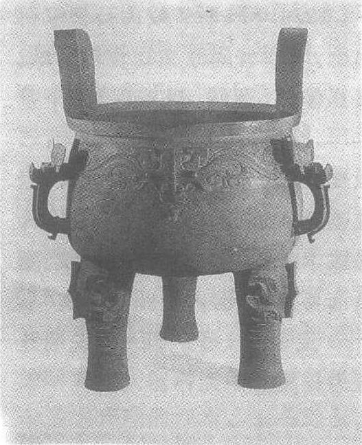 西周。通高122厘米,口径83厘米,腹深54厘米。重226公斤。1979年陕西省淳化史家塬出土。陕西省淳化县文化馆藏。鼎,古代炊具。商、周时多为青铜礼器。此鼎平沿折唇,上有双立耳,耳的外侧饰两条相向的龙纹,均以细雷纹填地。口沿下饰夔龙六条,两两相对。中间隔有短扉棱。夔龙卷尾,圆目凸起,张口卷唇,合观之,则为饕餮纹。饕餮之下有浮雕小牛首,造型奇特,栩栩如生。腹部还铸有三个兽首屈耳鋬,上有扉棱,各与一足相对,不但实用且富于装饰性。鋬上兽耳高耸,饰卷曲的夔龙。鋬下有钩珥。鼎足上饰浮雕饕餮面,四角突出器外,巨目利爪,咧嘴欲噬。主体花纹之外均用云雷纹填地。内底有三个直径为18.2厘米,深17厘米的圆窝,与鼎足相对。此鼎是我国目前已知的西周铜鼎中最大和最重的一件。其造型魁伟,形制、纹饰庄重神奇,是青铜器艺术宝库中的一件瑰宝。
